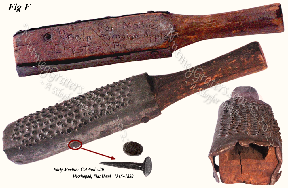 Invented by Samuel Gear in 1876, the common round-faced box grater for nutmeg has existed, little changed, for nearly one-hundred and fifty years ~ being mass-produced into the hundreds of thousands by numerous large corporations around the world. These remain widely available in stores today. Bryant & May LTD of London patented "a completely new process for printing on tins", and their spice boxes remained in production from the 1870's into the 1920's. Henry Saal's Ever-Ready, and the Damon brother's The Edgar nutmeg graters were assembled in production lines, being sold by the multiple gross in a single sale. However today, images of these same mass-produced items regularly are advertised for sale as "PRIMITIVE" (These described items shown here: Fig F); this includes some items in modern aluminum or stainless steal; sometimes marked "Taiwan". One can not help but wonder what Mr. Gear, Mr. Bryant, Mr. May, Mr. Saal, the Damon brothers, or any of the other manufacturers of these mass-produced items might think about their inventions being marketed during the early 21st century as "PRIMITIVE"!
