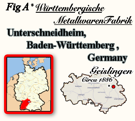 It is surprising that a late nineteenth century German metalware manufacturer would produce a fine silver-plate table nutmeg grater; this is most unusual because fancy table and pocket nutmeg graters were simply not a common part of the German food culture. Culinary practices throughout Europe were rigidly ethnocentric and insular between countries; with even smaller regions inside a country having uniquely localized food cultures and customs, often further subdivided in each region due to economic or class culinary differences. During the second-half of the nineteenth century, German metal-manufacturers began producing numerous mechanical nutmeg graters for bakers and kitchen preparations, but nutmeg used as a supplemental table condiment was popularly found usually only in France; not in Germany. About 1890 in Geislingen, Germany, Württembergische Metallwaren-Fabrik ["WMF"] (Fig A) designed and produced a formal silver-plate table nutmeg grater in the "French style" (Figs C1 & C2).